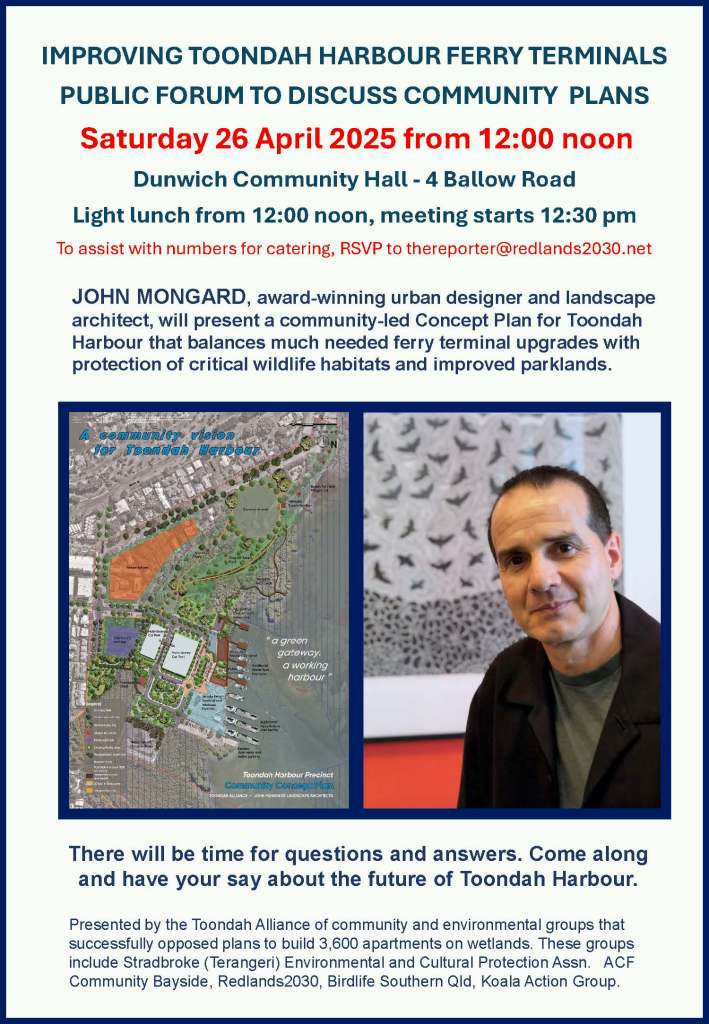 Our Association has remained active on the Toondah Harbour issue including because what happens at Toondah, the gateway to Straddie, has the potential to shape the future of the island. We were instrumental in the Toondah Alliance deciding to be proactive rather than wait for another plan from Walker Corporation. That decision led to the community based “Better Plan for Toondah Harbour”. As per the public meeting notice, it will be discussed at the Dunwich community hall on Saturday 26 April.